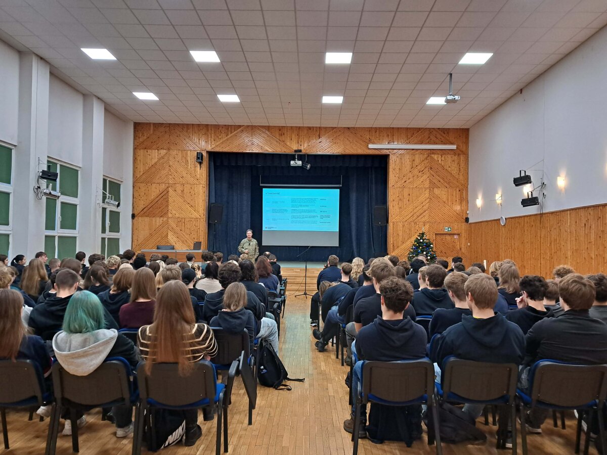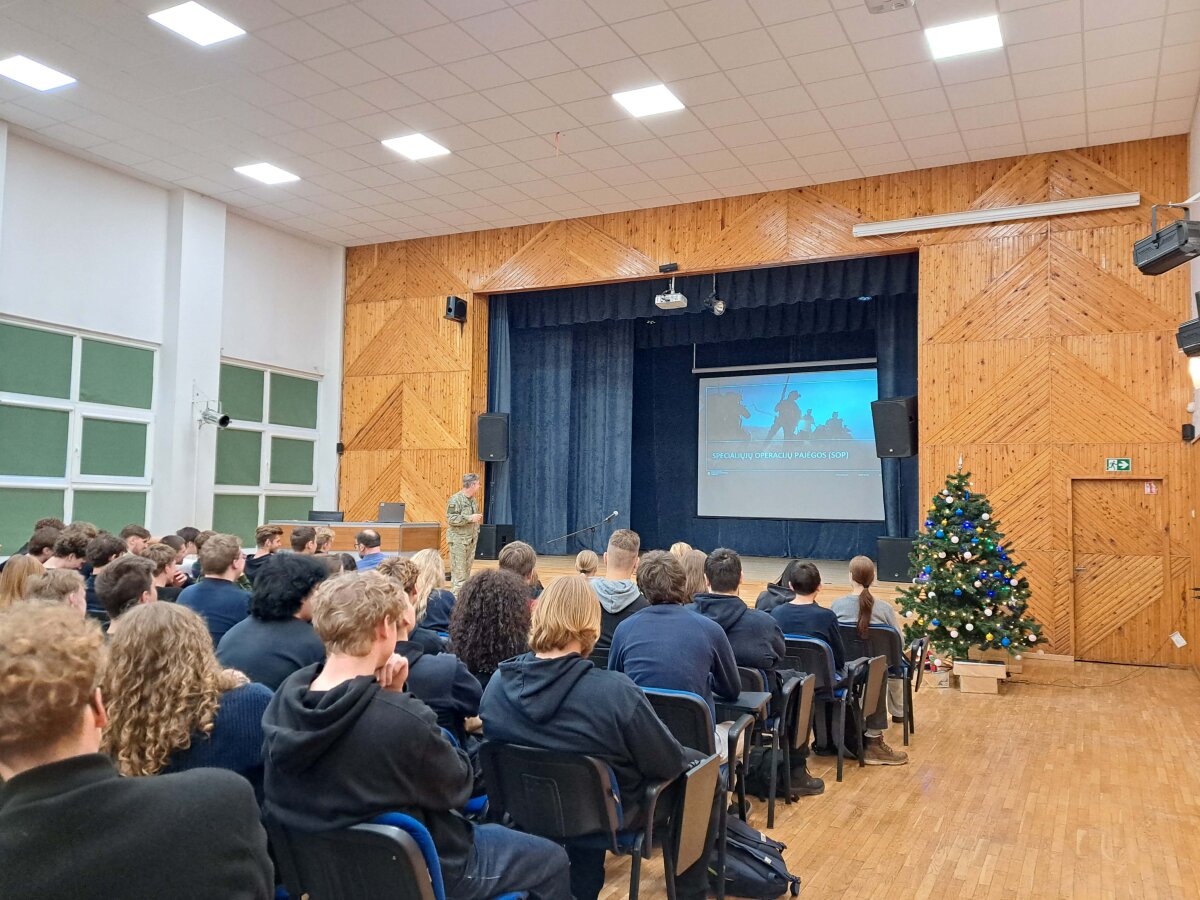 2025 gruodžio 9 d. gimnazijoje lankėsi Klaipėdos Karo prievolės ir komplektavimo cento vyr. verbuotojas Andrejus Fedijus, kuris dvyliktokams papasakojo apie tarnybos būdus, kaip mokiniai gali prisidėti prie krašto gynybos bei pristatė svarbius pakeitimus apie privalomąją pradinę karo tarnybą ir atsakė į mokinių klausimus.
